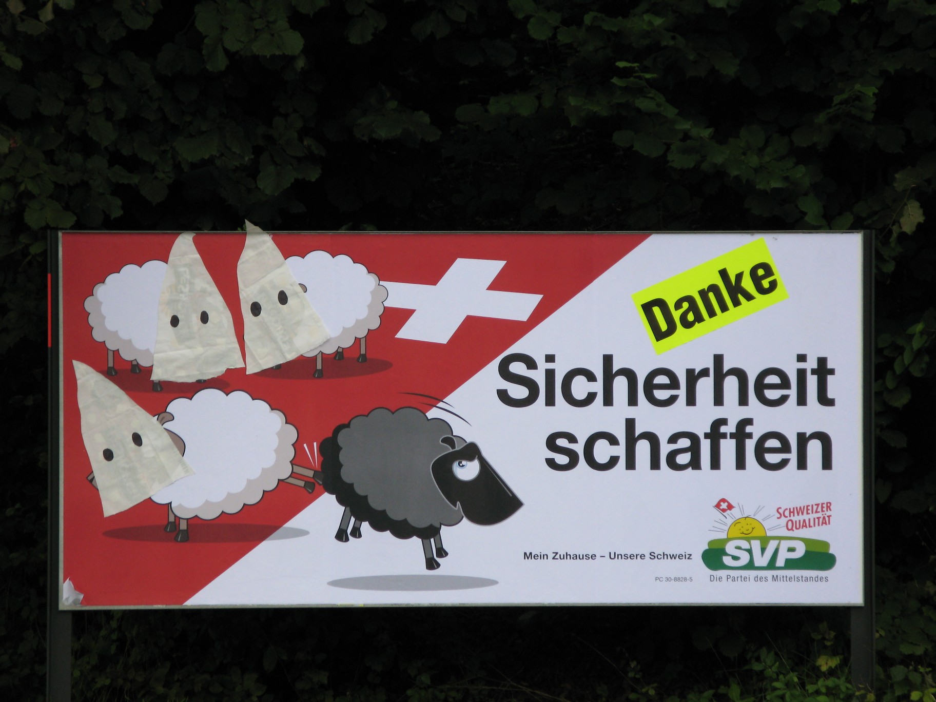 A 2007 Swiss People's Party billboard calling for the expulsion of foreign criminals -- altered to criticize its racist tone. Today, some people are anxious about large numbers of north African refugees, even if they're looking for work and not trouble.